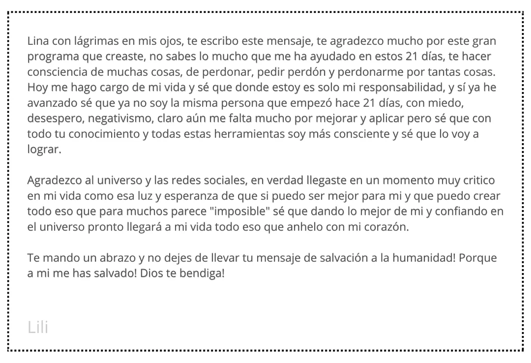 ¿Qué tal si te dijera que puedes hacer realidad esos sueños? Con este programa de 21 días para una vida más consciente, te guiaré paso a paso para reprogramar tu mente hacia la abundancia y el bienestar. Aprenderás a liberarte del miedo, la carencia y las creencias limitantes que te han estado frenando. ¡Imagina el poder de crear la vida que realmente deseas!
